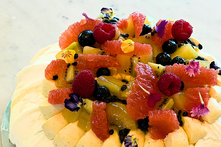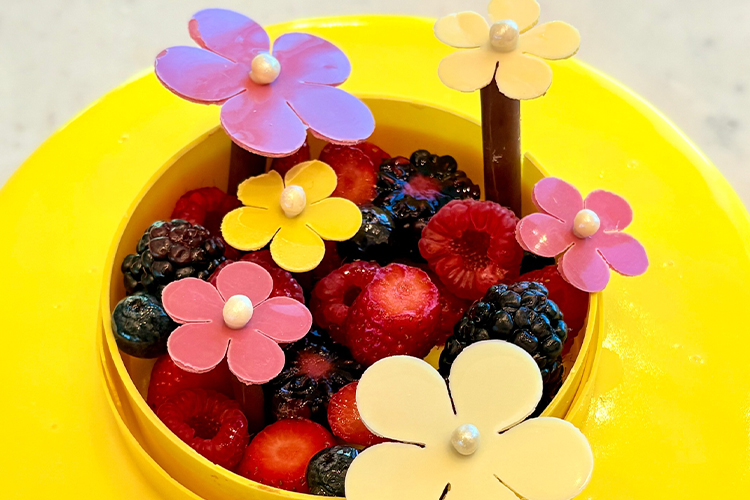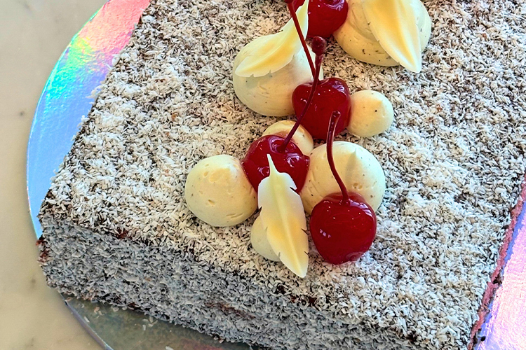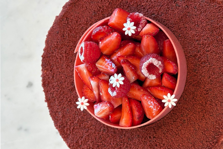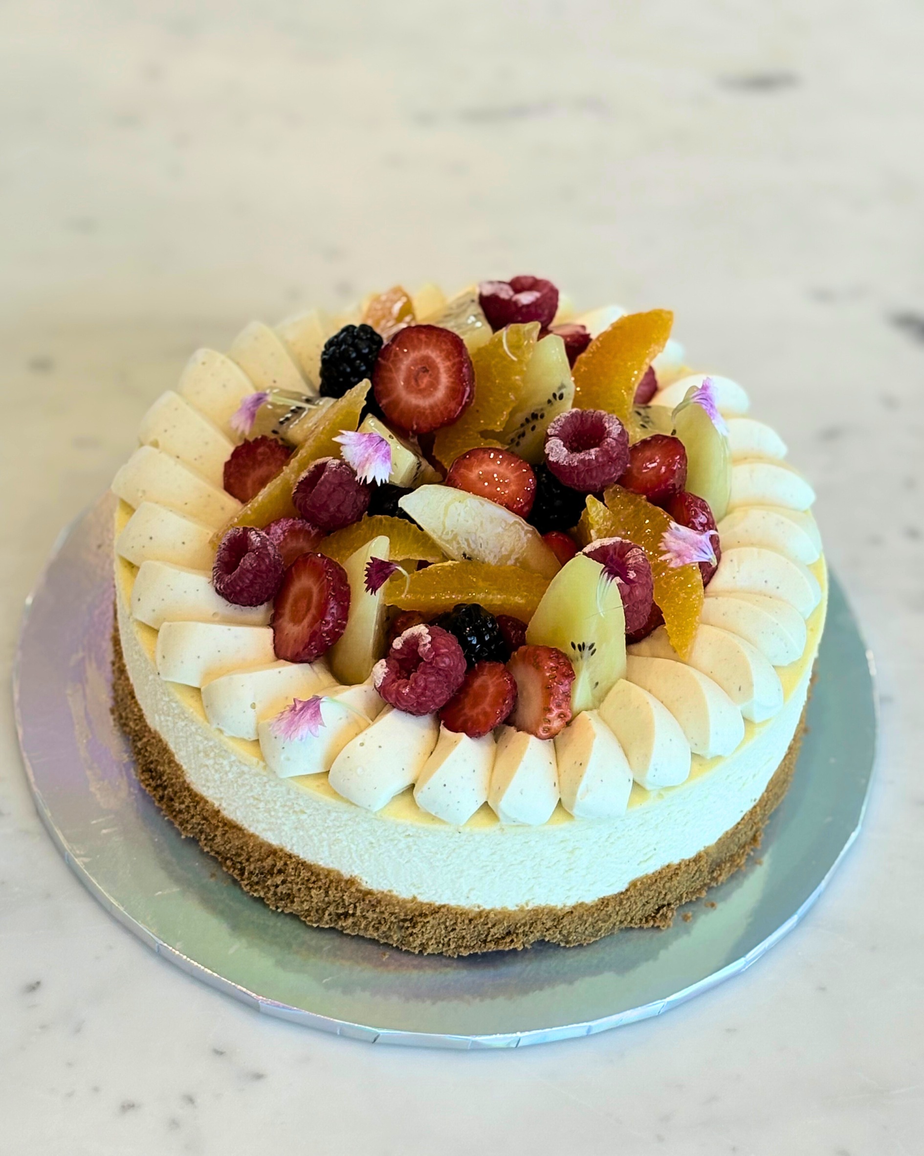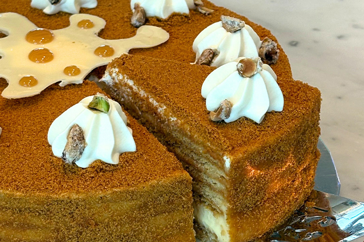 This elegant dessert is a celebration of honey in every bite. It features delicate, golden honey biscuit layers—soft yet slightly crisp, infused with the warm, floral notes of pure honey. Sandwiched between each layer is a luscious honey cream, offering a smooth, subtly sweet contrast that deepens the flavour profile. Crowning the cake is a generous swirl of mascarpone Chantilly.